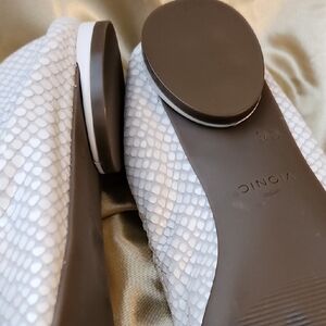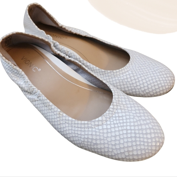 Elegant ballet flats with subtle snake-embossed texture. Elasticized topline for secure fit. Cushioned footbed with built-in arch support. Rounded toe for timeless style.