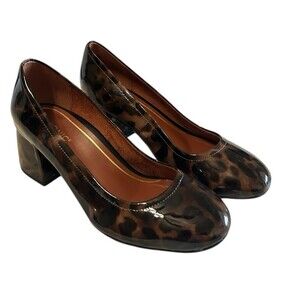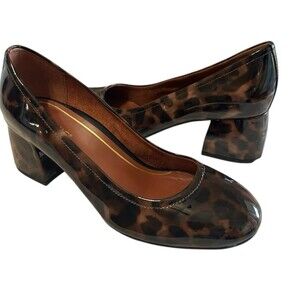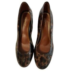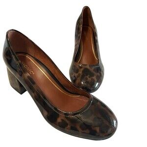 The Vionic Dress Pump in women's size 9 features a stylish leopard and caramel black patent leather design with a block heel, perfect for various occasions such as weddings, parties, casual outings, or even formal events. With a slip-on style and closed toe, these pumps provide comfort with a cushioned insole and leather lining, making them ideal for long hours of wear. The mid-height block heel adds a touch of elegance and stability, while the rubber outsole ensures durability. Perfect for summer, fall, and spring seasons, these Vionic pumps are a chic and practical choice for any fashion-forward woman.