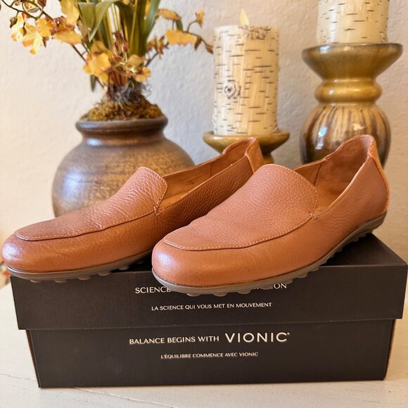 Women's leather Vionic "Elora" driving moccasin in the color "toffee" US size 9; in excellent pre-owned condition.