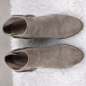 Vionic Faros Tan Suede Leather Fringed Upper Almond Toe Side Zip Ankle Bootie