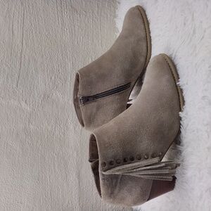 Vionic Faros Women's Taupe Tan Suede Leather Fringed Bonze Rivet Detail Upper Almond Toe Side Zipper Closure Blocked Heel Casual Luxury Ankle Bootie. Rubber Textured Sole. Fabric Lining. Suede Footbed. Light Suede Wear. Upper/Toe Marks Per Photos. Upper Heel Scuffs. Measurement approx. Heel: 2.5". Size 9 Color May Vary Due To Lighting.