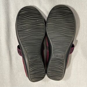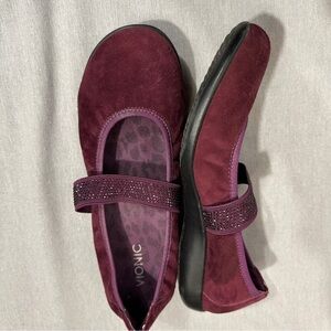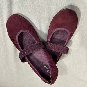Wine colored Vionic "Fern" suede Mary Janes with embellished strap. Comfortable, Orthaheel, great for walking.