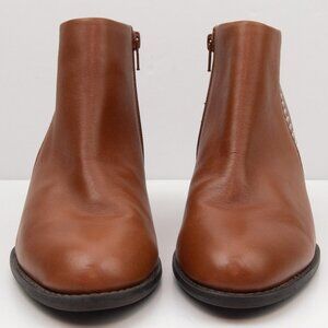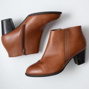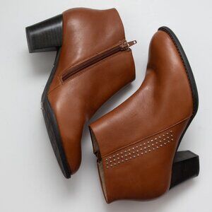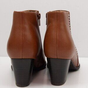 Vionic Georgia Pant Boot Leather Riveting Trim Studs Brown Size 7.5 Wide. This ankle bootie is fashionably adorned with riveting trim. Inside zip and gore offer slip-on sensibility and a secure fit. This beautiful boot features a breathable leather lining, and an enhanced forefoot contour in each footbed for greater comfort. Durable rubber outsole promotes all-day traction that grips on a variety of surfaces.
