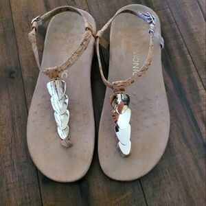 Excellent pre owned condition. Vionic - Gold and Cork Rest Miami Toe-post Sandal. Stay fresh all season long with the effortlessly wearable Miami t-strap designed with leather or natural cork uppers and lustrous cascading metal detail.