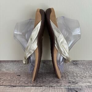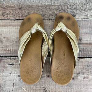 Stylish Vionic sandals with gold straps. Comfortable tan footbed. Perfect for casual wear.