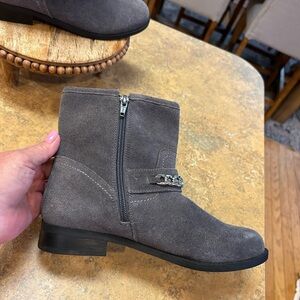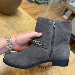 Step out in style with these chic gray suede ankle boots. Perfect for any occasion, these boots feature a sleek design with a stylish buckle detail. Ideal for adding a touch of elegance to your outfit. Size 7. Excellent condition. Heel 1”