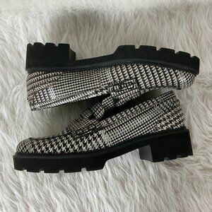 This is a pair of lug sole, houndstooth check, metallic gray, black, white & silver, slip on penny loafers from Vionic. No wear on foot beds and soles.
