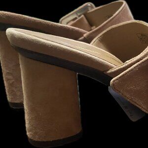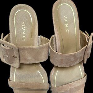 Vionic Heeled Suede Dress Sandal in a neutral/beige/tan color size 7W.