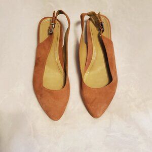 Lovely pair of Vionic flats, adjustable slingback closure and pointed tow, in a beautiful dusty rose color, size 6.5. These are in excellent used condition, very little wear. Genuine suede upper and the orthotic support that Vionic is known for.