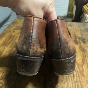 Good used condition- some scuffs to the leather shown in pictures. Adds to the overall distressed look of the leather. Some peeling on the heel shown in last picture. This is not visible when wearing the boot as it is on the inside part