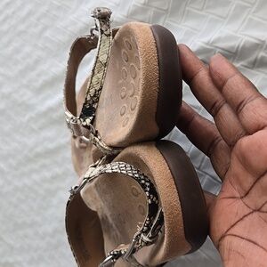 Stylish sandals with a snakeskin pattern. Features a comfortable tan sole.