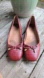 Women's dark brick red cap toe leather ballet flat. Bow accent at vamp with gold metal trim. Size 7. Pre-owned with light signs of wear highlighted in photos and video.