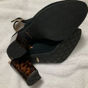 Vionic Lacey Tortoise black open heel suede shoe with gold buckle closure at ankle; NWOT (never worn); 3” heel; 7M