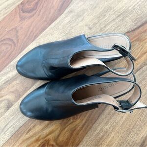 Features black leather upper, rubber block heel, buckle ankle clasp, open heel.