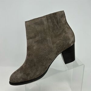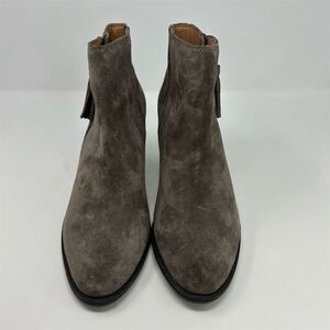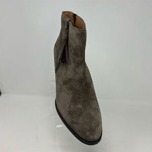 Keywords: Vionic bootie, women's ankle boots, gray suede boots, Madeline model, tasseled detailing, side zipper boots, block heel booties, weather resistant footwear, pre-owned Vionic shoes, women's suede booties, stylish gray boots, comfortable ankle boots, Vionic Madeline, women's fashion boots, zip closure booties.