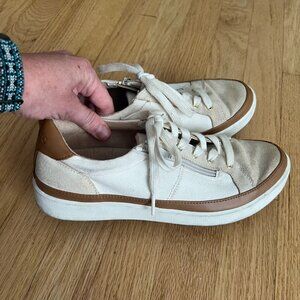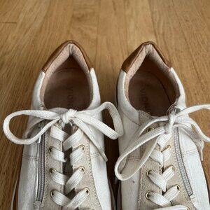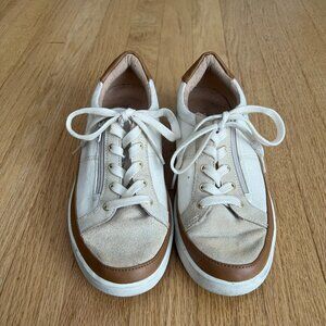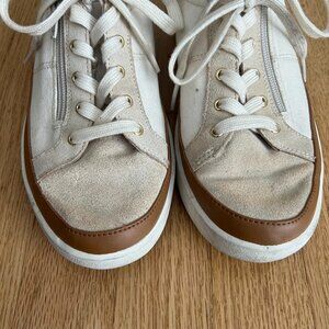 Vionic Mayra Suede Size Zip Lace Up Comfort Sneakers- Women's Size 8.5. Cream/beige/brown suede leather uppers, side zip & lace up closure, comfort insoles. In good condition.