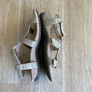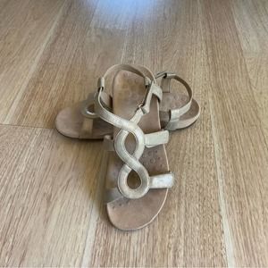 Vionic Metallic Creme Comfy Orthotic Jodie Backstrap Sandals Womens Size 10. Super comfy sandals in gently used condition. The Jodie adjusts to your perfect fit and style. Featuring an ankle strap; T-bar upper with intertwining loop design on the vamp and three adjustable hook-and-loop closures for a perfect fit.