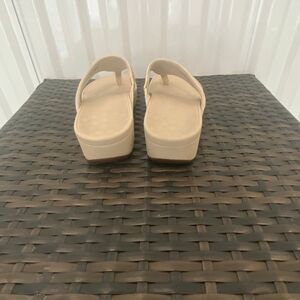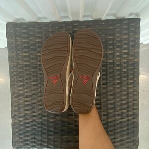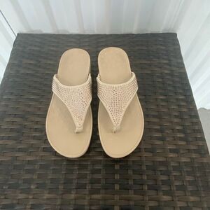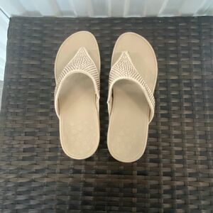 Vionic Naples sandals, women’s size 9 the color is tan in good preowned condition. They have rhinestones all over the straps normal wear and tear little scuffed up on the tips and toes in the back of the heels, overall and great shape.