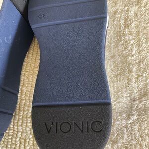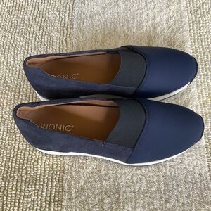Stylish Vionic flats in navy blue. Comfortable and versatile design.