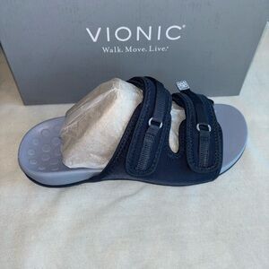 Stylish Vionic slide sandals in navy and gray. Ideal for everyday comfort.