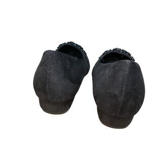 Faux gemstones with shimmery seed beads embellish the toe of this dressy velvety suede-like microfiber flat. Dress up casual pants or more formal outfits with these comfortable heel supporting flats.