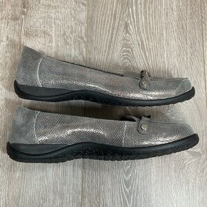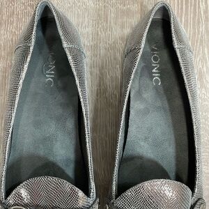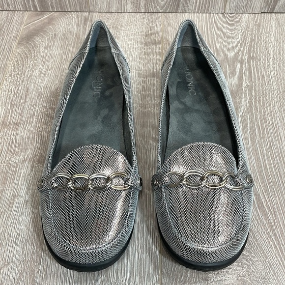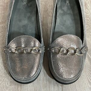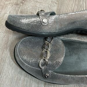 Vionic Orthoheel Alda Pewter Leather Reptile Slip On Loafers Chain 8.5W