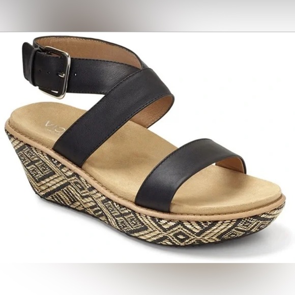 Vionic wedges 2 pairs one with sleek black straps and one colorful with pink and brown straps Comfortable beige footbed with signs of wear. Intricate patterned wedge heels. Run wide.