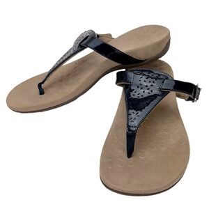 Vionic Perforated T-Strap Tropez Glossy Navy Patent Thong Sandals SZ 9 Orthotic