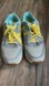 This is a pair of Vionic Rechelle sneakers. They are gray with yellow accents and laces. They are in good condition. The soles have very little very. There is some wear throughout including on the back of the inside heels. Please look through the photos and inquire with any questions.