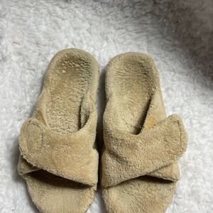 Vionic Relax Slippers terry cloth rubber soles with arch support Velcro strap size 7 pre owned in fair condition no tear the inner soles are faded see all pictures any questions please message.L2