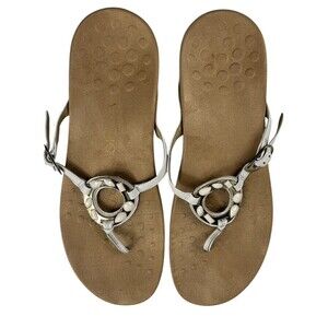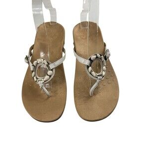 Vionic Ricci Thong Sandals White Leather Straps Goldtone Hardware Jewels Size 10
