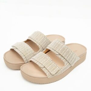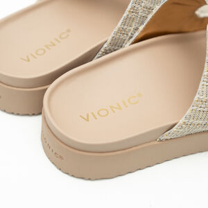The Vionic Riviera Sandals in a cream and gold textile. Designed with adjustable woven straps and a lightweight platform sole, these slides blend effortless summer style with Vionic’s trusted orthotic support. The shock-absorbing sole and deep heel cup deliver lasting comfort and balance with every step — ideal for all-day wear.