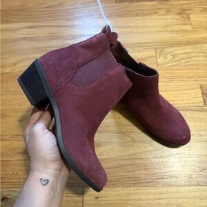 Water-repellent suede upper, color-matched gore panel, medial inside zip closure, pull-tab heel