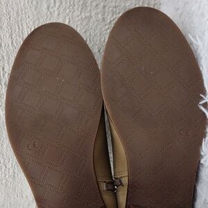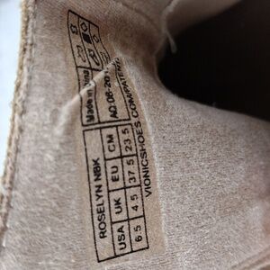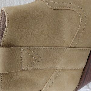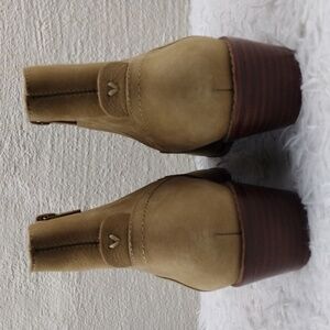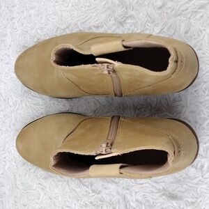 Vionic Roselyn Women's Tan Suede Leather Upper Almond Toe Stack Heel Side Zipper Closure Western Coastal Cowgirl Casual Weather Resistant Ankle Boots. Rubber Sole. Suede Leather Lining/Footbed. Light Sole Mark. Measurements approx. Heel: 1 3/4". Size 6.5. NWOT Color May Vary Due To Lighting.