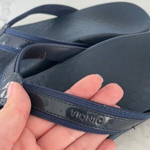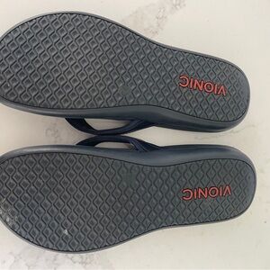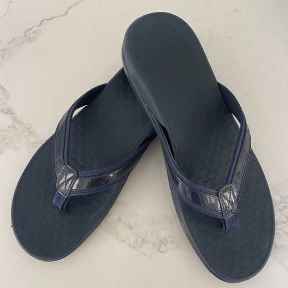 Step into comfort with these stylish navy blue VIONIC flip flops with simple straps. Perfect for arch support and cushioned steps. Size 9.5 and gently used :)