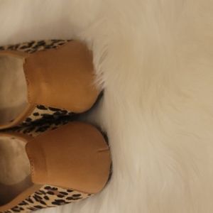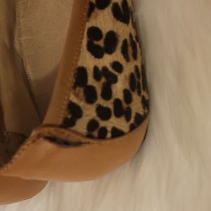 Vionic Shoes, leopard print. hair like and leather. Bow in front. Cognac leather accents. Great condition. Small scuffs in front but not noticeable when wearing. could be resolved with a light polishing. Small tear on side of back of shoe. Barely visible, as pictured and priced. Still great condition and plenty of wear. could be restitched for about $10. size 7.5