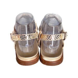 Vionic Palm Boca is a fun, yet elegant sandal. The shiny gold color with diamond snake like texture adds a touch of elegance, while the large rhinestone accents give a hint of luxury. The strappy design and wedge heel provide both support and fashionable flair, making them suitable for casual wear, travel, parties or even a summer wedding! Women's size 6.5M. Gently preowned.