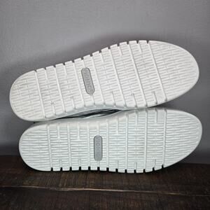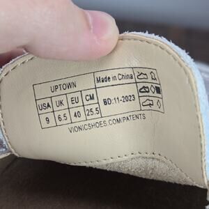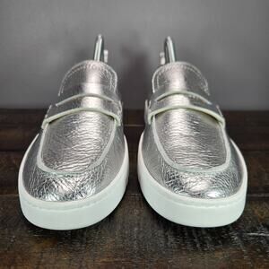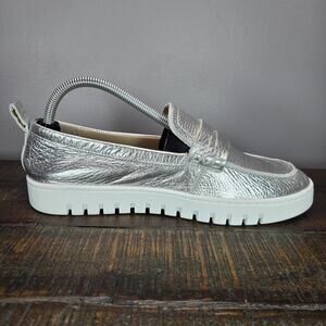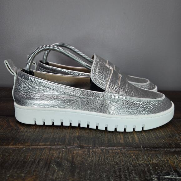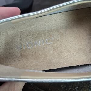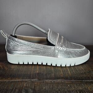 According to Poshmark AI, these are stylish silver loafers by Vionic. Features a sleek design with white soles. Perfect for casual wear.