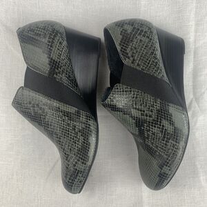 Keywords: Vionic, wedge booties, ankle boots, faux snakeskin, elastic closure, comfort shoes, womens boots, gray boots, black boots, contemporary, modern style