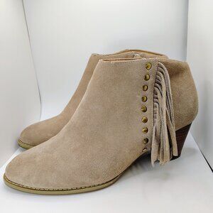 Step into fall style with these Vionic suede ankle boots, size 8.5. Crafted from soft beige suede and finished with boho-inspired fringe and antique gold-tone stud details, these booties bring a Western-meets-modern vibe to your wardrobe. The stacked block heel offers stability and style, while the inner zipper makes them easy to slip on and off.