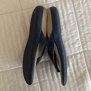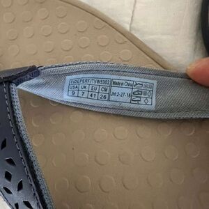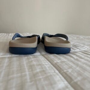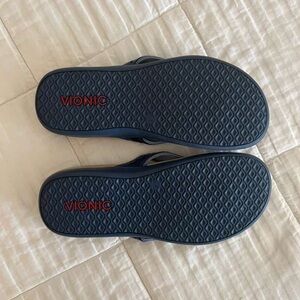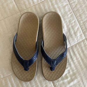 Stylish Vionic sandals with navy straps. Tan footbed for comfort. Perfect for everyday wear.