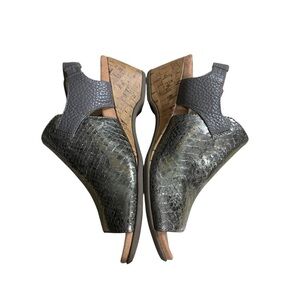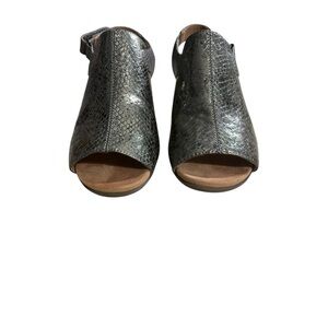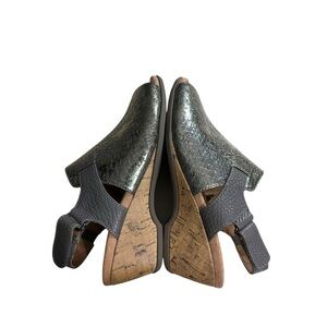 Metallic snake-embossed leather upper, adjustable backstrap with hook-and-Podiatrist-designed, biomechanical orthotic footbed with Orthaheel® technology and a deep heel cup helps stabilize, support, and realign feet back to their natural position while wearing