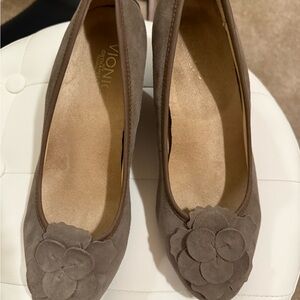 Chic Vionic suede wedges in taupe. Features a stylish floral design. Comfortable and versatile.