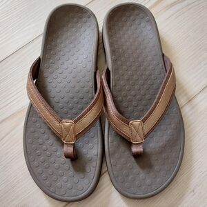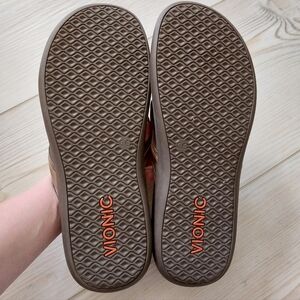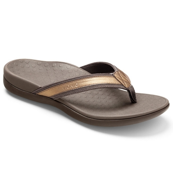 Vionic Tide II toe post sandals in bronze. Metallic leather and textile strap, biomechanically designed anatomic footbed with great arch support. Lightweight, shock absorbing foot beds reduce stress and fatigue in the feet and legs. Gently worn, excellent condition. Size 10. First photo is stock, others are the actual item being sold.