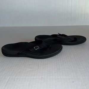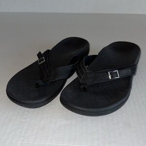 Vionic Tide Patty black orthotic flip flop sandals. Small flaw on outside left shoe as seen in photo. Size 7. Please see all photos for condition and wear. Pre owned.
