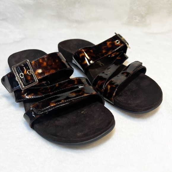 Stylish tortoiseshell pattern. Adjustable buckle straps. Comfortable footbed.