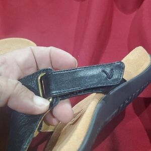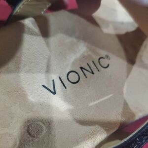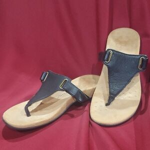 Experience unparalleled comfort with Vionic's black and tan sandals, featuring a contoured footbed for enhanced support. The thong-style design includes a wide strap and an adjustable buckle, ensuring a perfect fit for any occasion. black pebbled leather Ideal for all-day wear, these sandals combine style and functionality effortlessly. excellent used condition no issues
