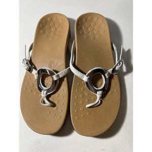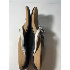Stylish sandals featuring white straps and tan soles. Silver accents add a chic touch.