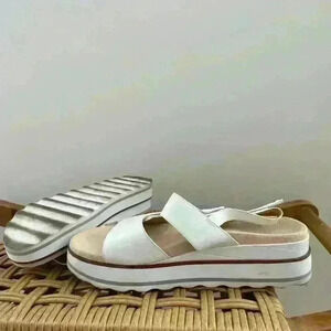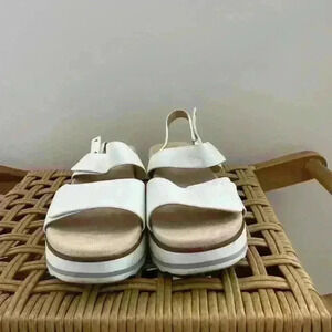 Leather hook-&-loop closure straps make this platform sandal comfy—wavy details, mixed textures, and layered colors make it cool.