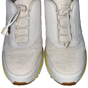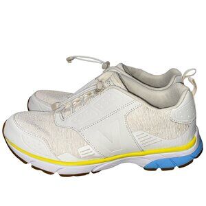 These Vionic Deon sneakers offer a sleek design combining marshmallow white and yellow hues. Elastic laces provide easy on-off, ensuring a snug fit, while the cushioned sole supports daily activities.
